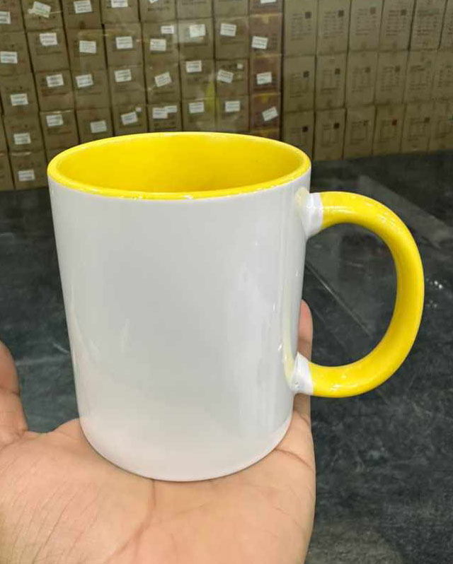 A Yellow Double Tone Mug is a coffee mug or cup that features a contrasting yellow color on the inside and potentially the handle,